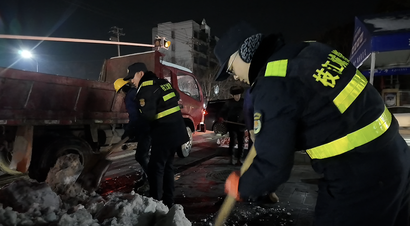1月21日凌晨五点,天色未亮,城区主次干道上已是一片忙碌景象。城管执法人员与环卫工人手持铁锹、雪铲,奋力清除路面积雪和暗冰。他们配合默契,将铲起的积雪迅速堆积、装车,从黑夜忙碌至天明。
