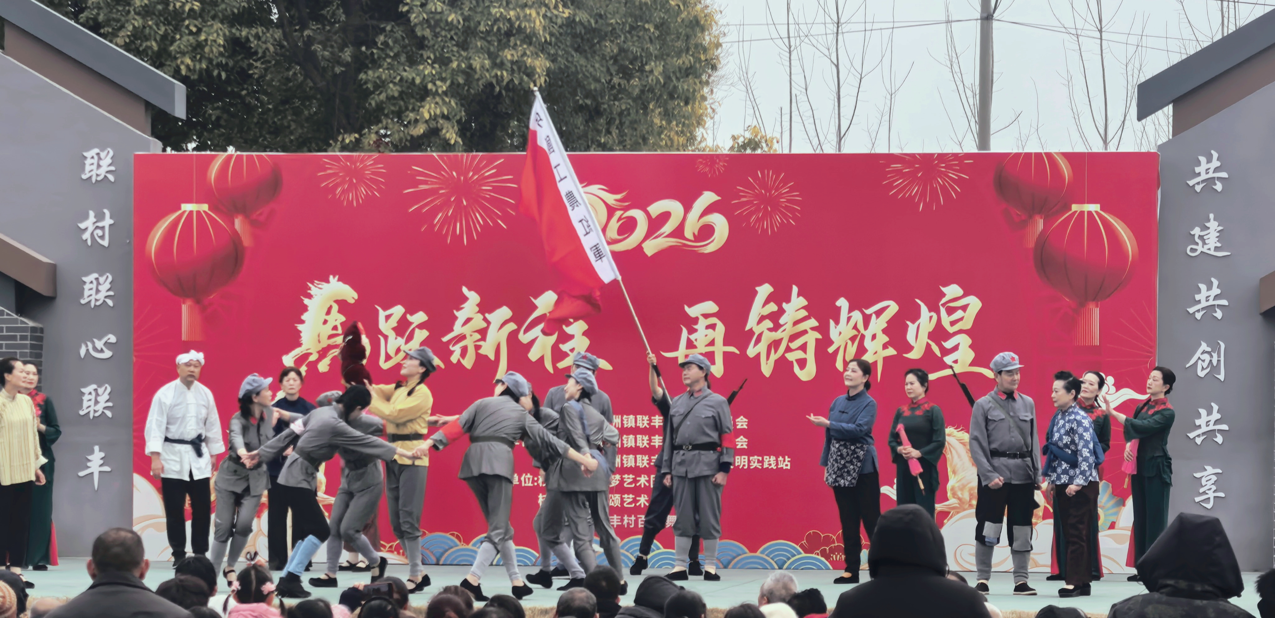 晚会节目形式多样、内容精彩,汇集了歌舞、戏曲、情景剧、器乐合奏等15个特色表演。枝江市风雅颂艺术团、洲之梦艺术团与联丰村百姓舞团、乡贤代表队、干群代表队同台献艺。开场鼓舞《万马奔腾》以激昂的节奏点燃全场;《五星红旗》《幸福山歌》等歌舞表演洋溢着喜庆祥和的节日氛围;三句半《俺村环境变了样》用质朴的乡言土语生动讲述村庄焕新颜的故事;情景剧《十送红军》、京剧对唱《我们是工农子弟兵》深情传递红色基因与家国情怀;胡庆英带来的变脸表演、乐曲合奏《赛马》将现场气氛推向高潮。最终,晚会在歌舞《盛世欢歌》中圆满落幕。