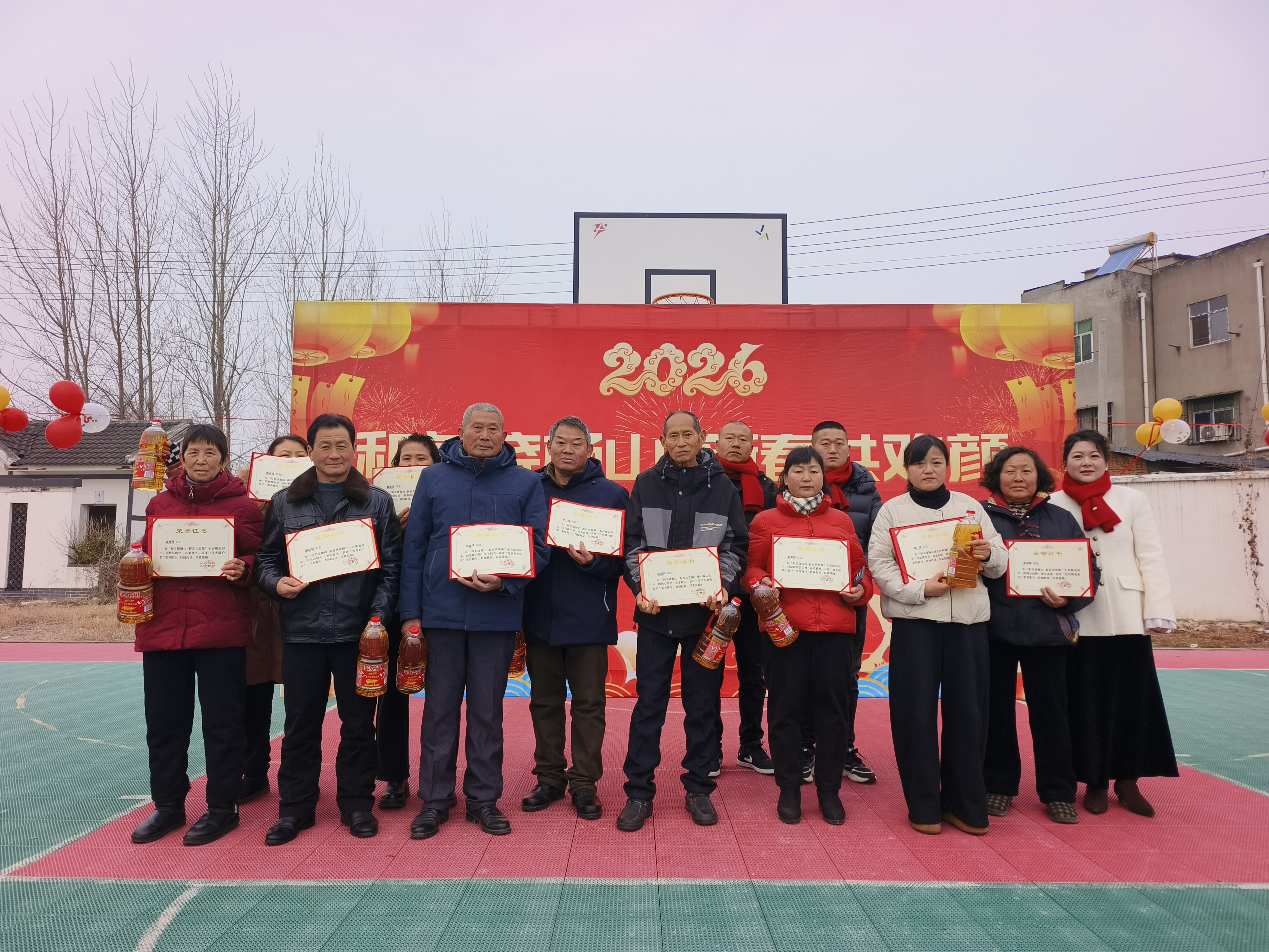 随后,文艺汇演正式拉开帷幕。参加活动的村民们轮番登场,舞姿灵动、歌声悠扬,每一个节目都饱含着村民对美好生活的热爱。演出间隙,村“两委”班子为最美家庭、优秀联户长、产业致富能手等先进典型颁奖,受表彰代表手持证书与慰问品合影留念,笑容里满是自豪,以榜样力量激发村民共建和美乡村的热情。