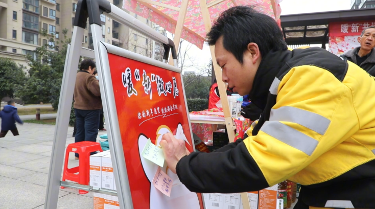 活动现场设置了暖“新”礼包发放点,一份份满载关怀的节日物资被递到网约车司机、快递小哥等劳动者手中。一旁的“微心愿”留言板也吸引了许多居民驻足书写,这些心愿后续将由爱心商家与公益组织对接认领,助梦成真。书法爱好者现场书写春联福字,居民还可体验传统拓印技艺,年味十足。