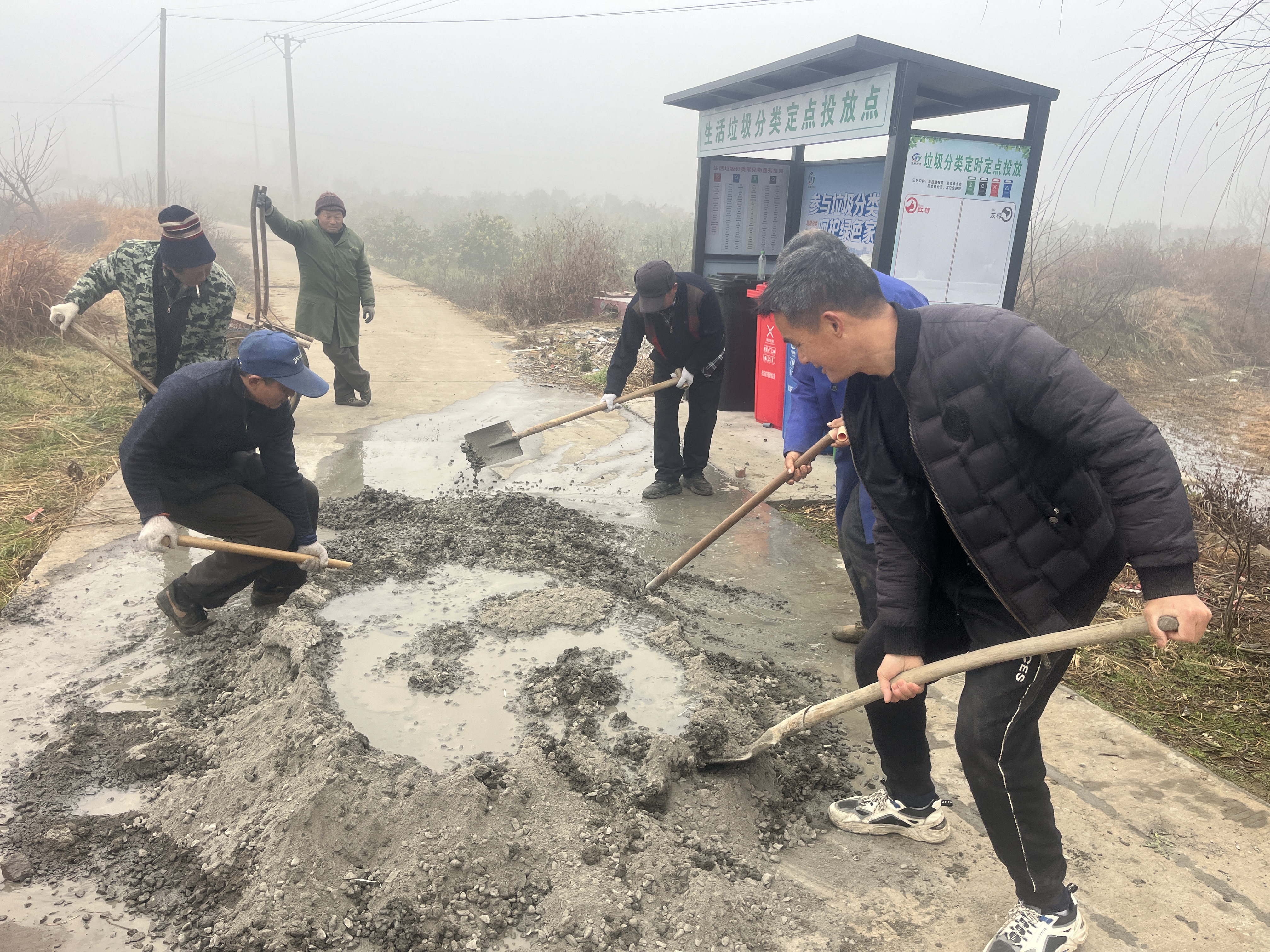 现场参与施工的村民分工明确、协作默契,大家自带铁锹、锄头、推车等劳动工具,有序开展路面清理、坑洼填补等作业。据悉,此次道路修复所需的砂石、水泥、木板等全部材料均由村民自发捐赠。大家心往一处想、劲往一处使,认真修复每一处破损路段,全力保障道路修复质量,让破损路面重新变得平整通畅。
