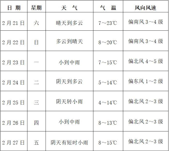 枝江未来一周天气预报(2月21-27日) 2026-02-20 16:36 0 未来一周(2月21-27日)我市前期天气晴好,气温回升,后期多降水。其中22日夜间至23日受高空波动和地面冷空气共同影响,有小到中雨,伴有6~8级阵风;25日至26日受高空波动和地面冷空气共同影响,有小到中雨。 具体预报如下: 来源:枝江市气象局