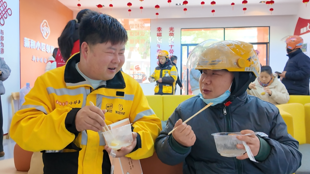 外卖骑手周吉说:“平时都是我给别人送餐,今天能坐下来吃碗社区送的甜汤圆,心里特别暖。这碗汤圆吃在嘴里,甜在心里。”