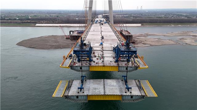 江风凛冽,却难掩建设热潮。在南主塔下方,运载着钢箱梁的运输船精准抵达指定位置,巨型桥面吊机正将重达数百吨的梁段缓缓提升。截至目前,大桥钢箱梁吊装已完成20组,节后复工首日便迅速进入满负荷运转状态,全力冲刺剩余梁段架设任务。