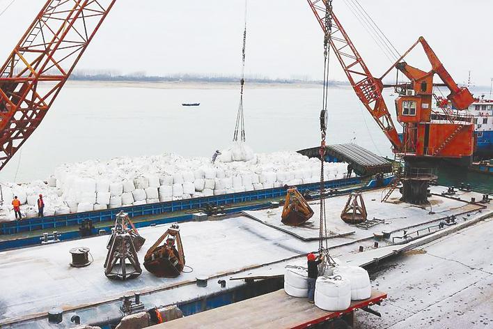 码头之上,机械轰鸣不息,舟楫往来如梭;高大吊机舒展巨臂,精准高效完成货物装卸(如图),封闭式传输带高速运转,满载物资的船舶接连鸣笛启航,繁忙有序的作业场景,已然成为这里的常态。