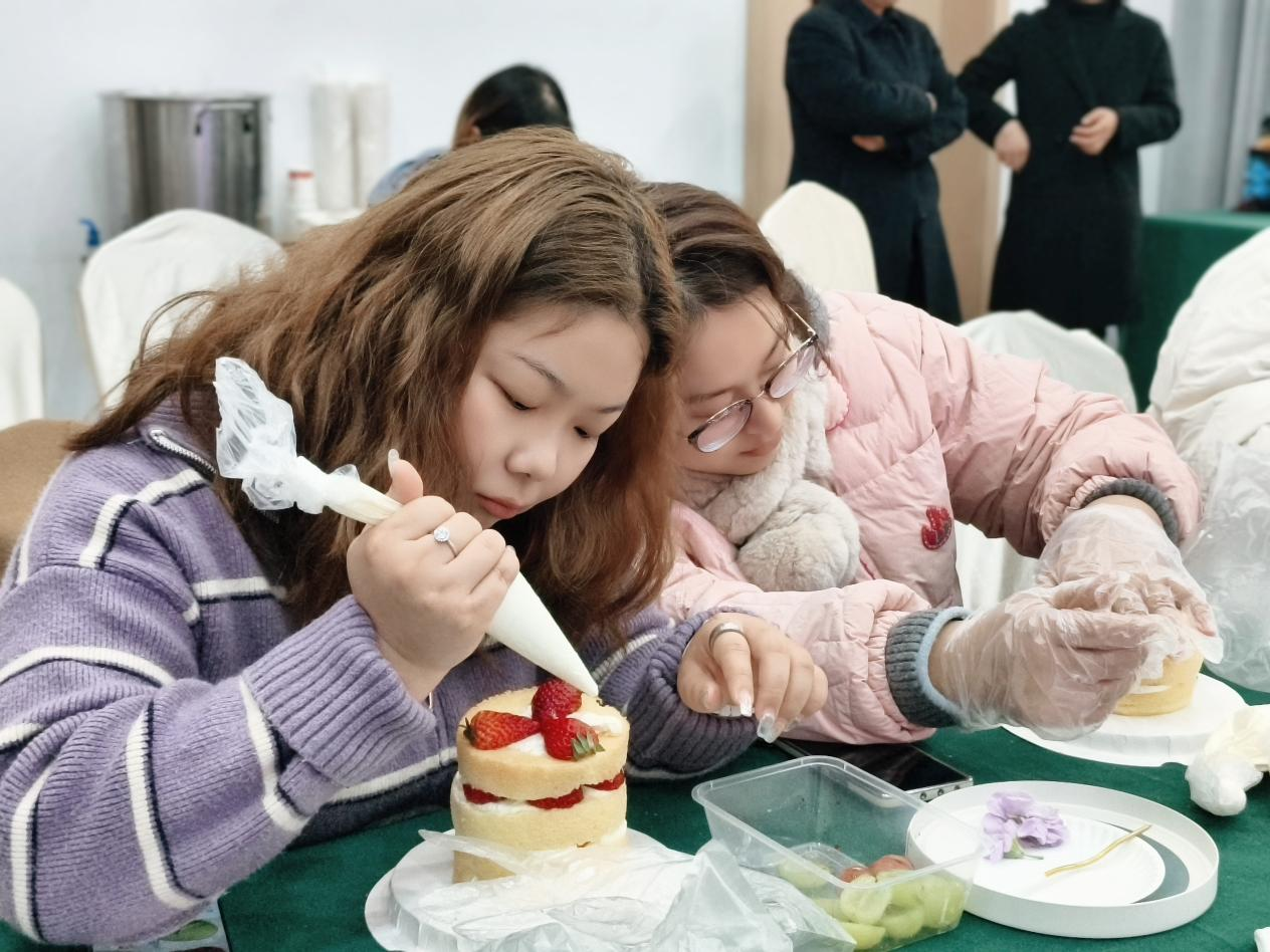 活动现场温馨有序,专业烘焙老师现场讲解蛋糕制作技巧,并手把手指导大家操作。参与人员兴致高涨,从抹奶油、摆放水果到创意装饰,每一步都细致认真,大家相互交流、分享心得,欢声笑语间增进了情谊,展现出基层女干部职工团结协作、积极向上的巾帼风貌。