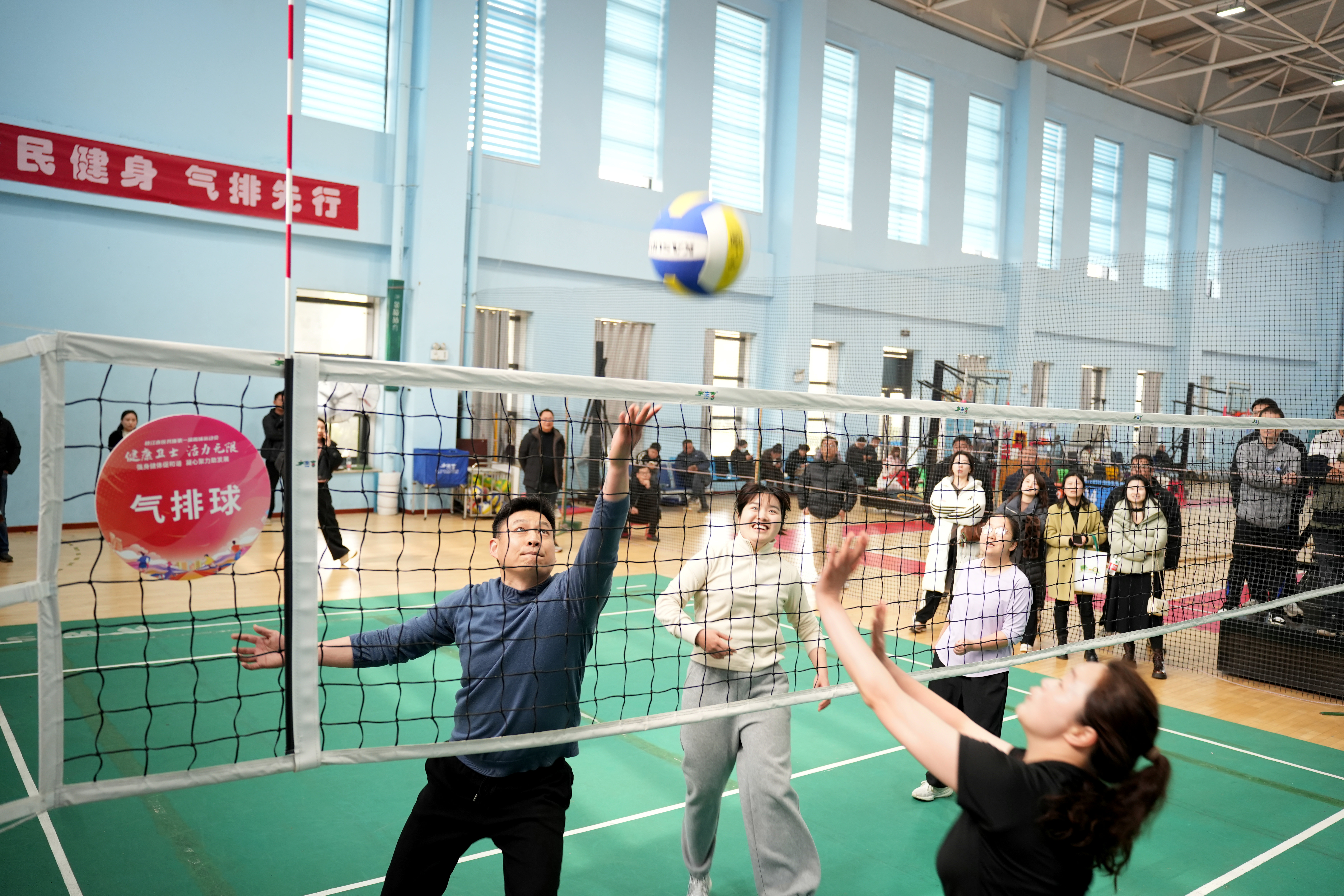 开幕式特别邀请退休医生杨柏家带来传统曲艺——枝江楠管《守护健康,活力飞扬》,韵味十足的唱腔点燃全场热情。气排球、担架接力、协力运球、拔河四个项目轮番开赛,加油声、欢笑声此起彼伏。