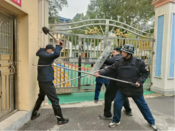 演练模拟“可疑人员强行闯入校园”场景。安保人员立即启动应急处置预案,迅速穿戴防暴装备,手持钢叉、警棍等器械与“歹徒”周旋对峙,全力阻拦其进入教学区域。在全体教职工的协同配合下,“歹徒”被成功控制,险情解除。