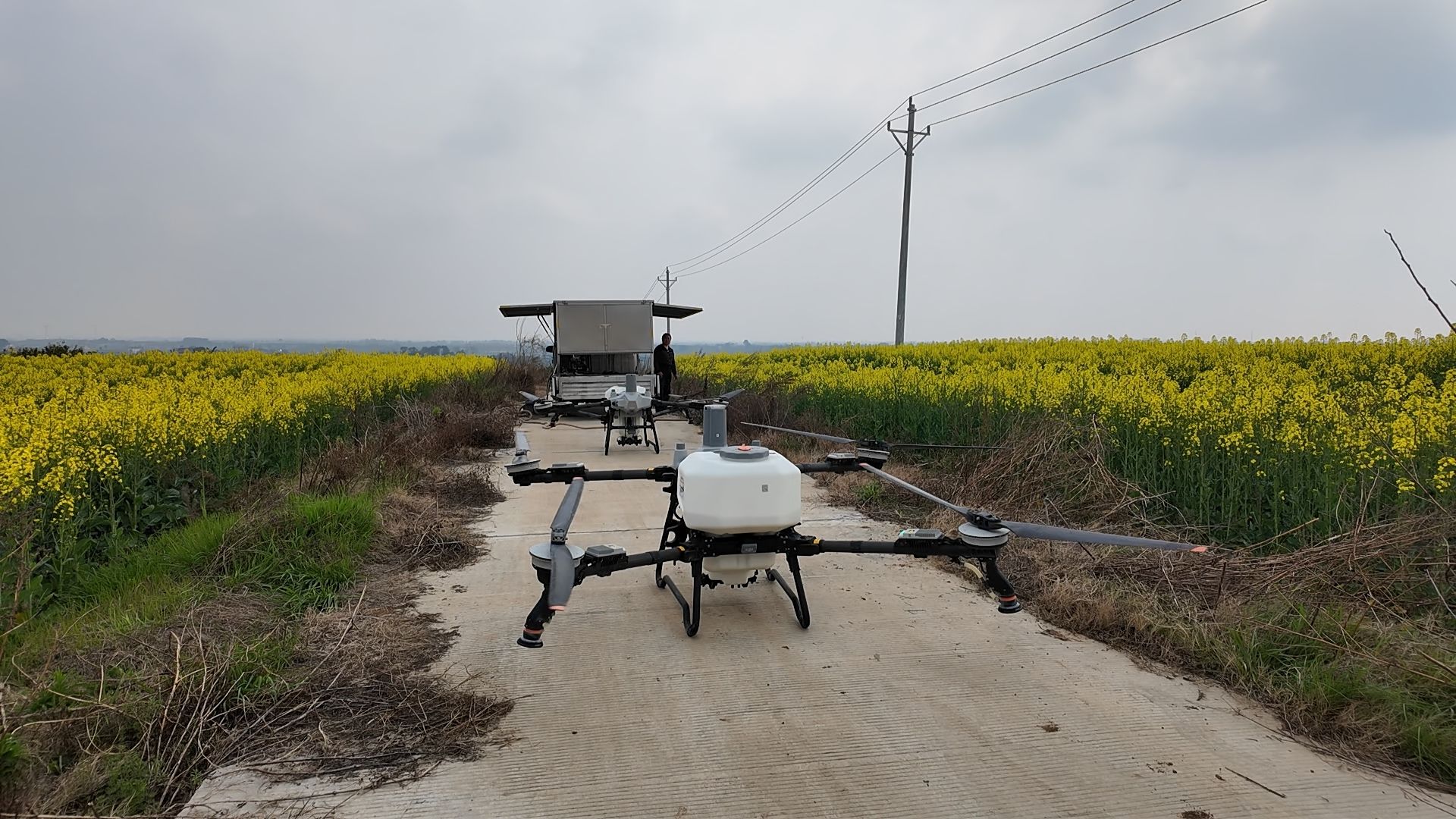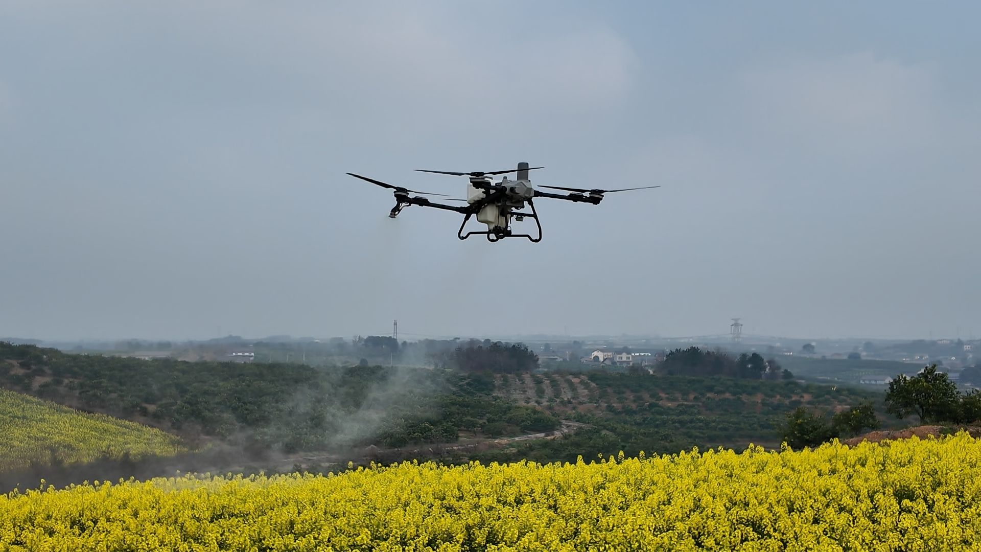 在仙女镇向巷村的油菜种植基地,连片的油菜生机盎然。伴随着低沉的嗡鸣声,数台植保无人机在技术人员的操控下腾空而起,沿着预设航线匀速盘旋,将调配好的药剂均匀喷洒在油菜叶片上,短短几分钟便完成了数亩田地的作业。