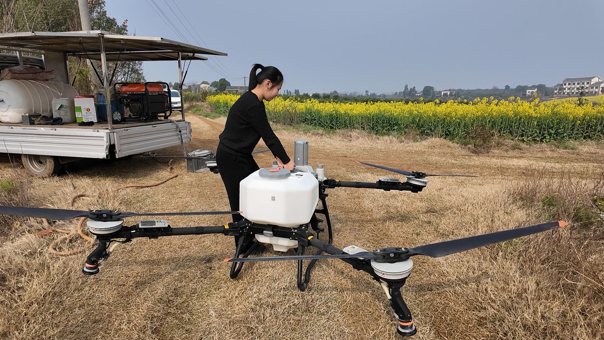 “过去人工背着喷雾器打药,人累效率低,而且现在油菜长得密,人一下田很容易损伤植株,踩踏造成的减产不可小视,喷洒也不均匀。”枝江市久全农机专业合作社的农机手许丽娜站在田埂上,正熟练地将配比好的药液注入无人机药箱。她指着正在作业的无人机对记者说:“现在用无人机就方便多了,我们事先对田块进行定点测绘,作业时基本不用人工干预,全程智能化。效率也极高,一台无人机一个上午就可以轻松作业两百亩,大大节省了人力物力。”