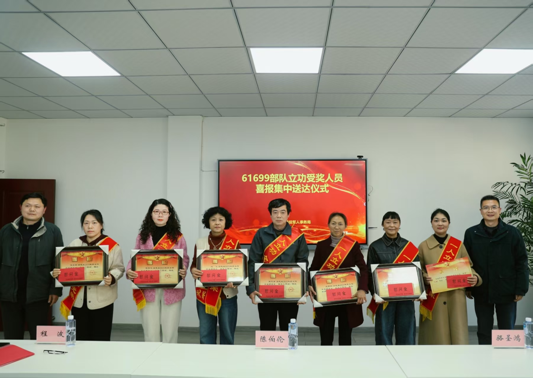 仪式现场气氛庄重热烈,市退役军人事务局副局长与驻枝某部队政治工作部副主任依次为6名荣立三等功官兵和1名“四有”优秀军官军属佩戴绶带、颁发喜报和慰问金,向立功官兵及家属表示热烈祝贺与崇高敬意。