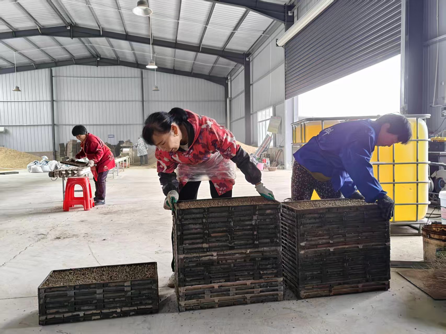 3月24日,合作社育秧车间内一派繁忙。自动化育秧设备高效运转,社员们分工协作,有条不紊地进行装土、洒水、播种、覆土等工序。大家干劲十足,熟练操作育秧流水线,将培育好的秧盘整齐码放,为后续秧苗生长做好准备。机械化育秧不仅提高了作业效率,更保障了秧苗的均匀度与成活率,为规模化种植奠定了基础。