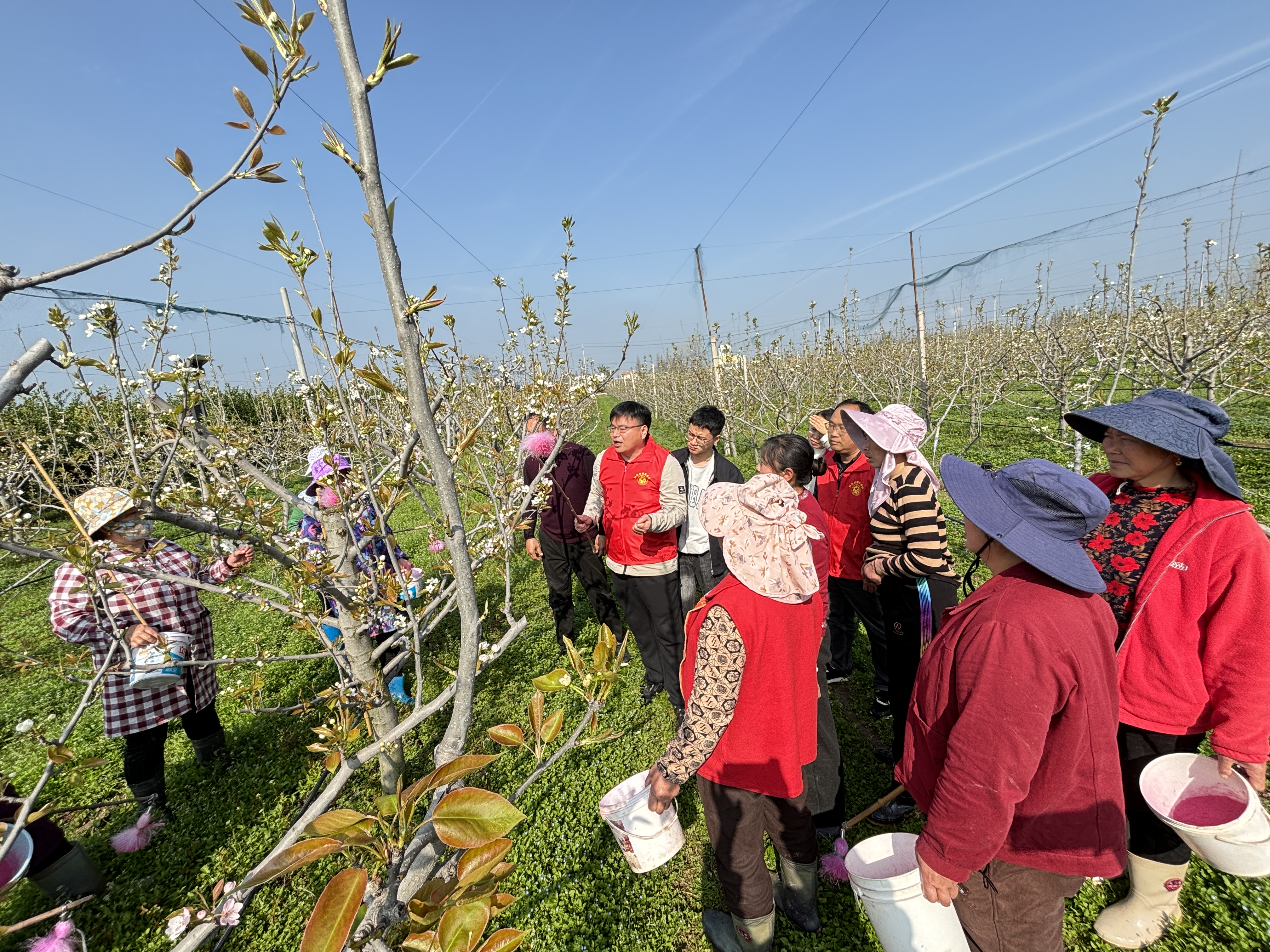 指导现场,专家从授粉时间、温度,授粉次数等方面为果农们讲解梨树人工授粉注意事项。利用通俗易懂的语言和实际动手操作示范,让在场果农知道了如何给梨花授粉从而提高坐果率。果农们一边仔细聆听一边抓住机会不停提问。