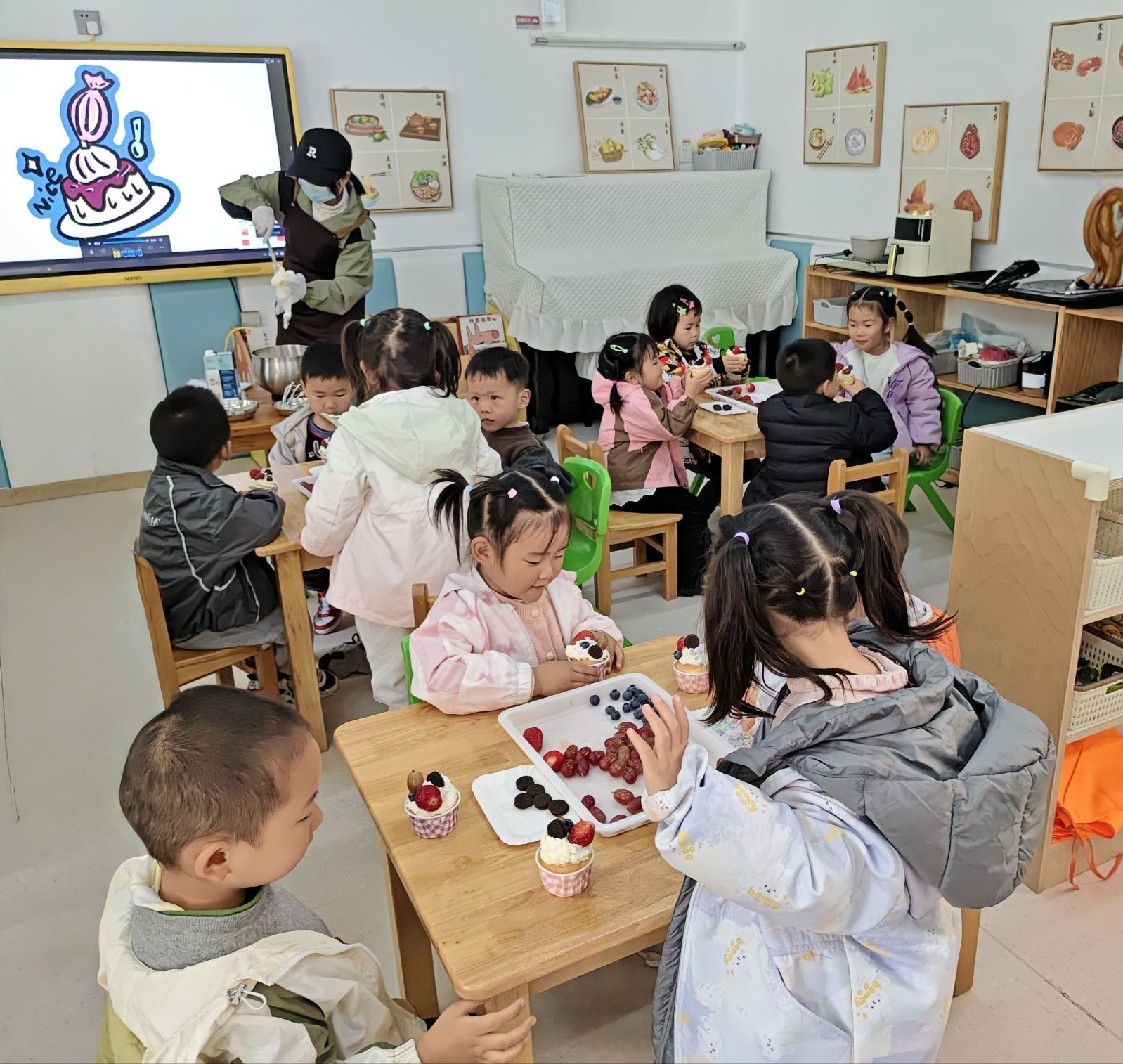 “哇,好香啊!”伴随着奶油的清甜香气,幼儿园食育坊里暖意融融。小一班的烘焙师家长耐心细致,从奶油打发到水果装饰,一步步示范。孩子们在家长的指导下亲手挤花、摆盘,品尝着亲手制作的美味。