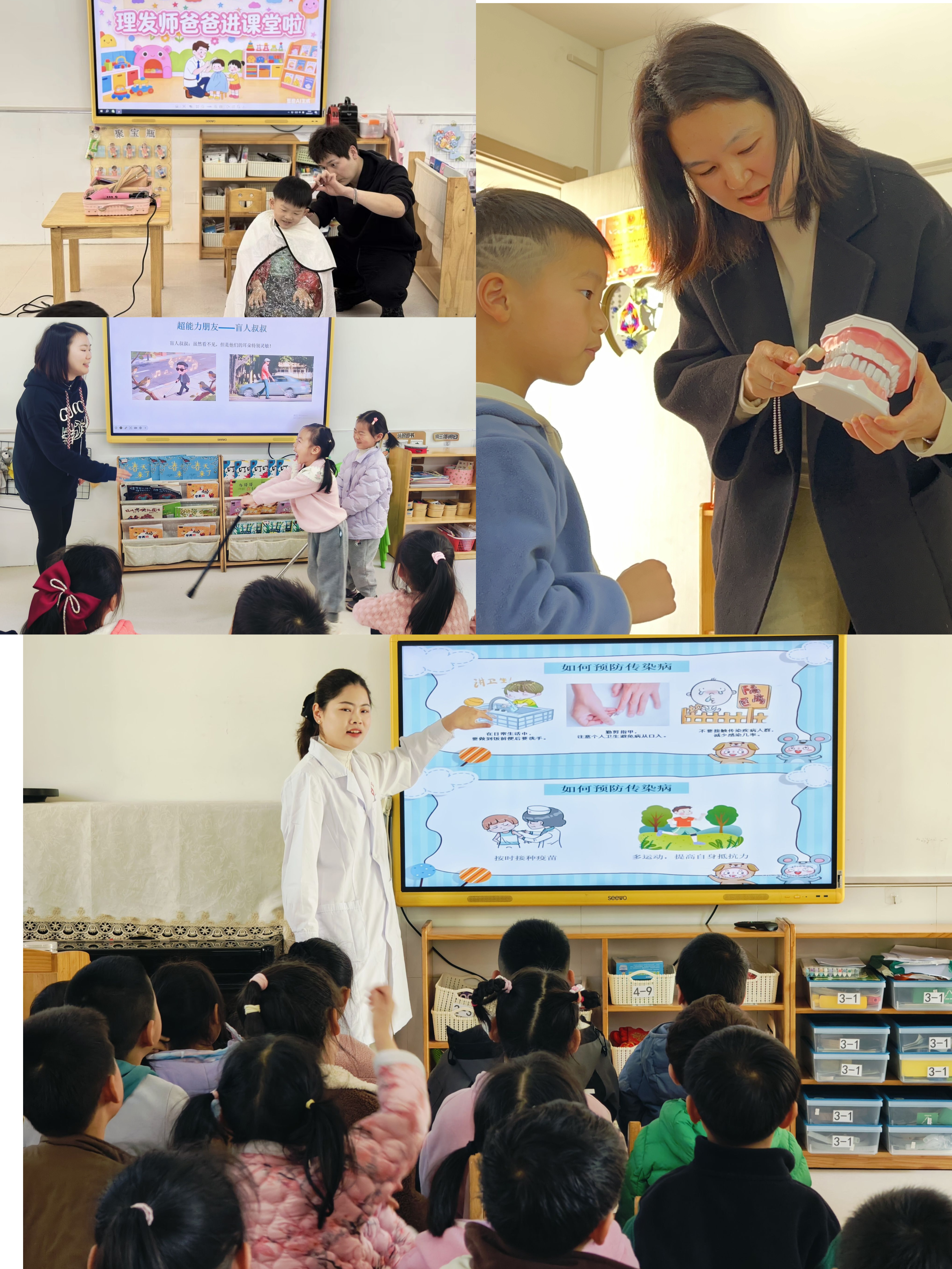 与此同时,健康与成长的课堂也精彩纷呈。形象塑造课堂上,理发师家长演示工具用法,消除理发焦虑,讲解卫生常识。健康守护课堂上,牙医家长借助牙齿模型,通过趣味问答教会孩子们正确刷牙。暖心教育课堂上,残联工作者家长用温情故事引导孩子关爱特殊群体,传递平等正能量。健康防护课堂上,医生家长科普春季防病知识,让孩子们在听诊游戏中探索身体奥秘。