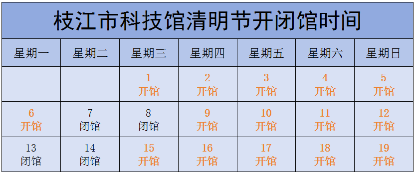 为方便广大市民参观,枝江市科技馆现将清明节期间开闭馆安排通告如下: