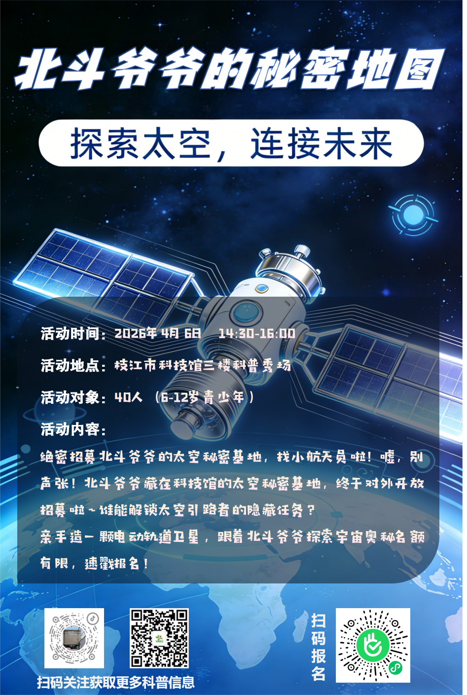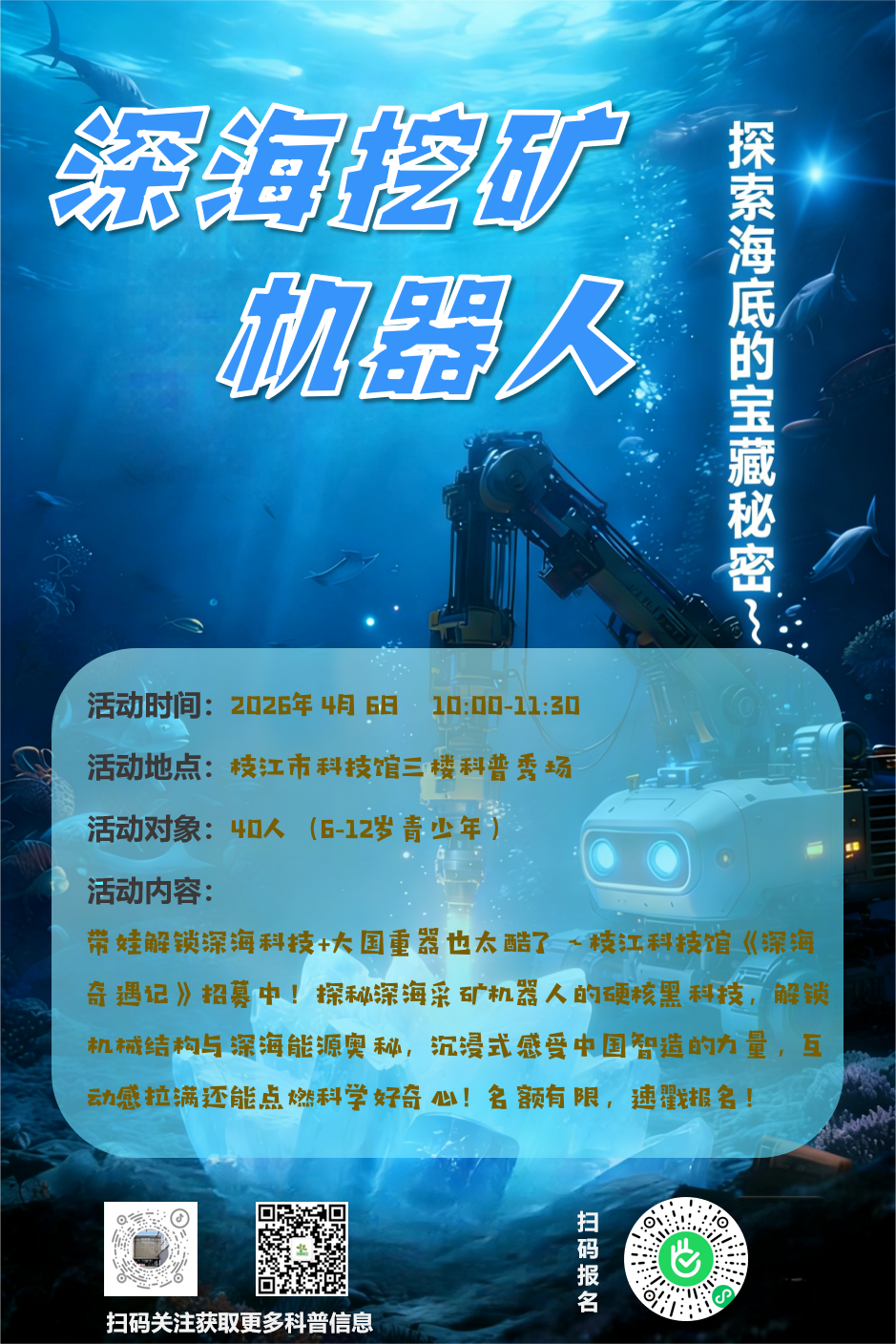 2.两场活动分别有专属报名二维码,微信扫码报名,满额即止。请大家选喜欢的活动报名,重点留意报名活动时间。因公共资源有限,报名后请及时到课,否则会影响下次参加科技馆其他活动的资格。