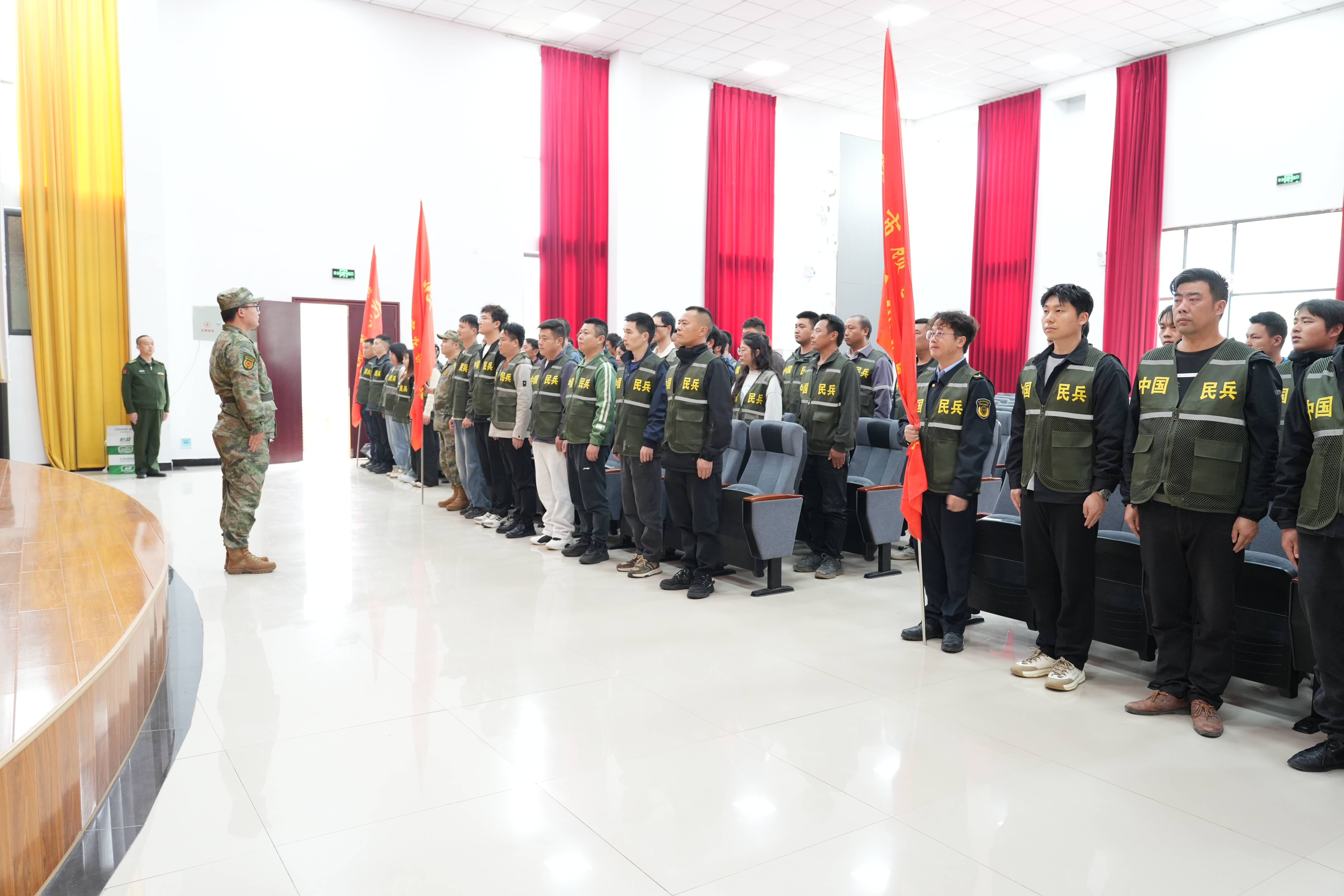 点验大会在雄壮的《中国人民解放军军歌》中正式拉开帷幕。现场秩序井然、气氛庄重,全体民兵队列整齐、严整,充分展现出新时代基层民兵过硬的纪律作风和良好的精神风貌。