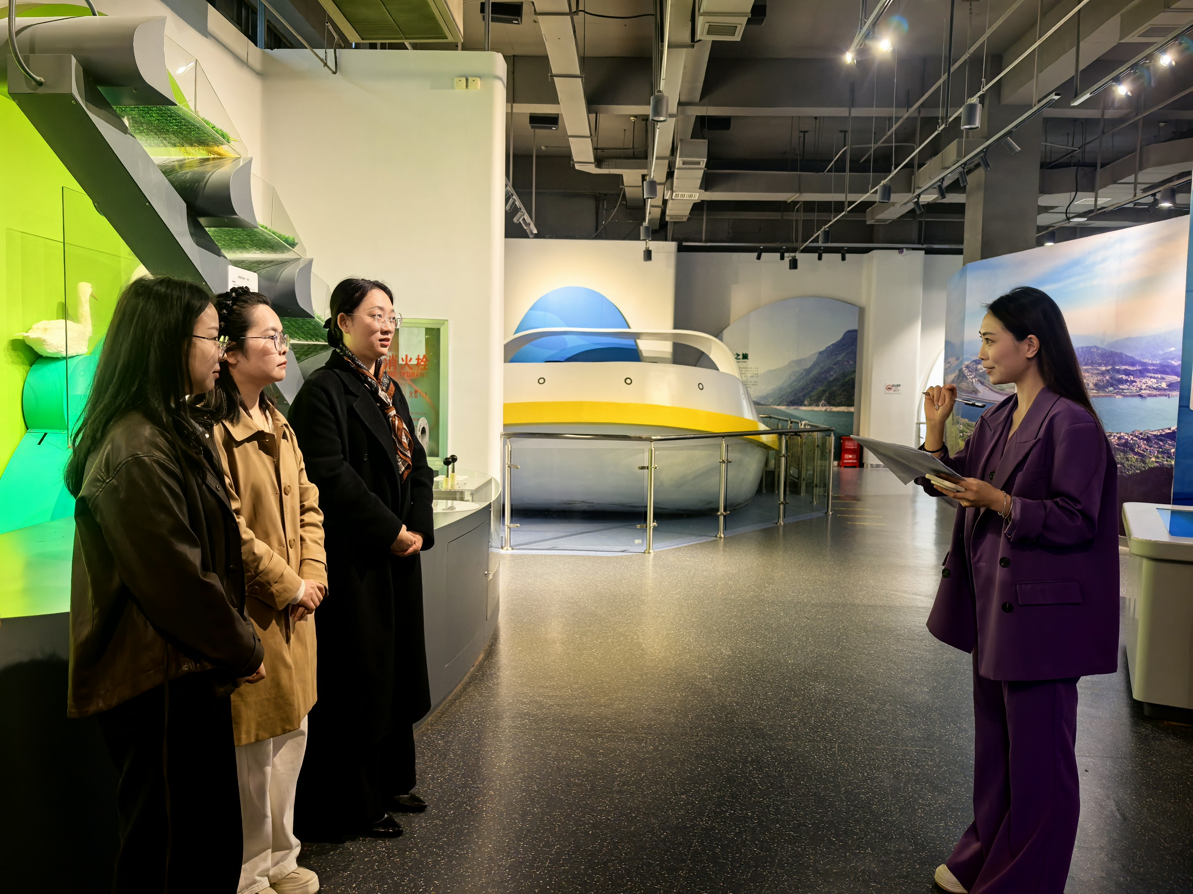 培训以“实战化、精准化”为核心,分阶段推进教学。在三楼科普秀场,严老师围绕讲解过程中的注意事项、如何提高展品讲解的吸引力等方面,与参训人员深入交流,从专业的角度提出解决问题的思路与办法。随后,全体参训人员到一楼展区,开展全流程实操演练。三名科技馆讲解员代表现场实操,严老师针对讲解员的仪态仪表、语言表达、肢体动作等细节逐一解析,针对每一个环节都耐心点评、细致纠偏。