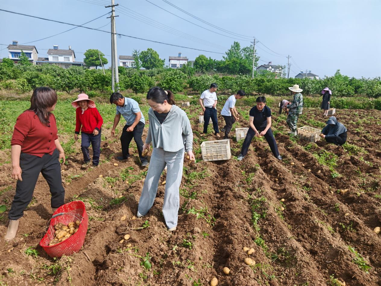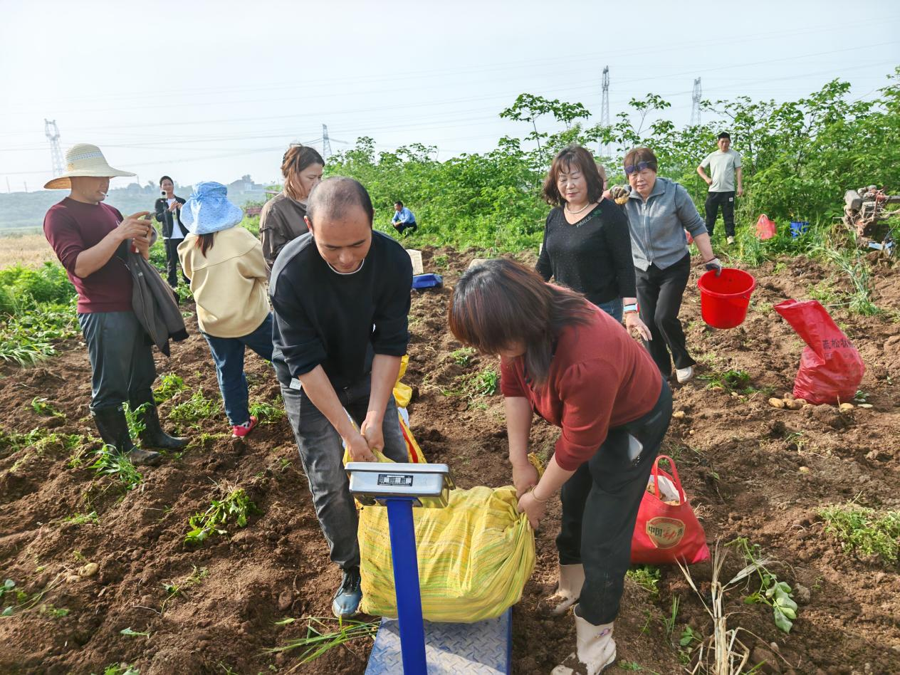 更强大的帮扶力量紧随其后——柏杨冲村的驻村帮扶单位枝江市市场监督管理局公共检测检验中心派出十余名党员干部赶到田头,撸起袖子加入采挖队伍,并当场认购600余斤土豆。在各方努力下,仅一天就售出2000余斤。刘大爷激动地说:“比我自己拿去卖每斤还高出4毛钱,太感谢大家了!”