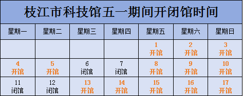 为方便广大市民参观,枝江市科技馆现将五一期间开闭馆安排通告如下: