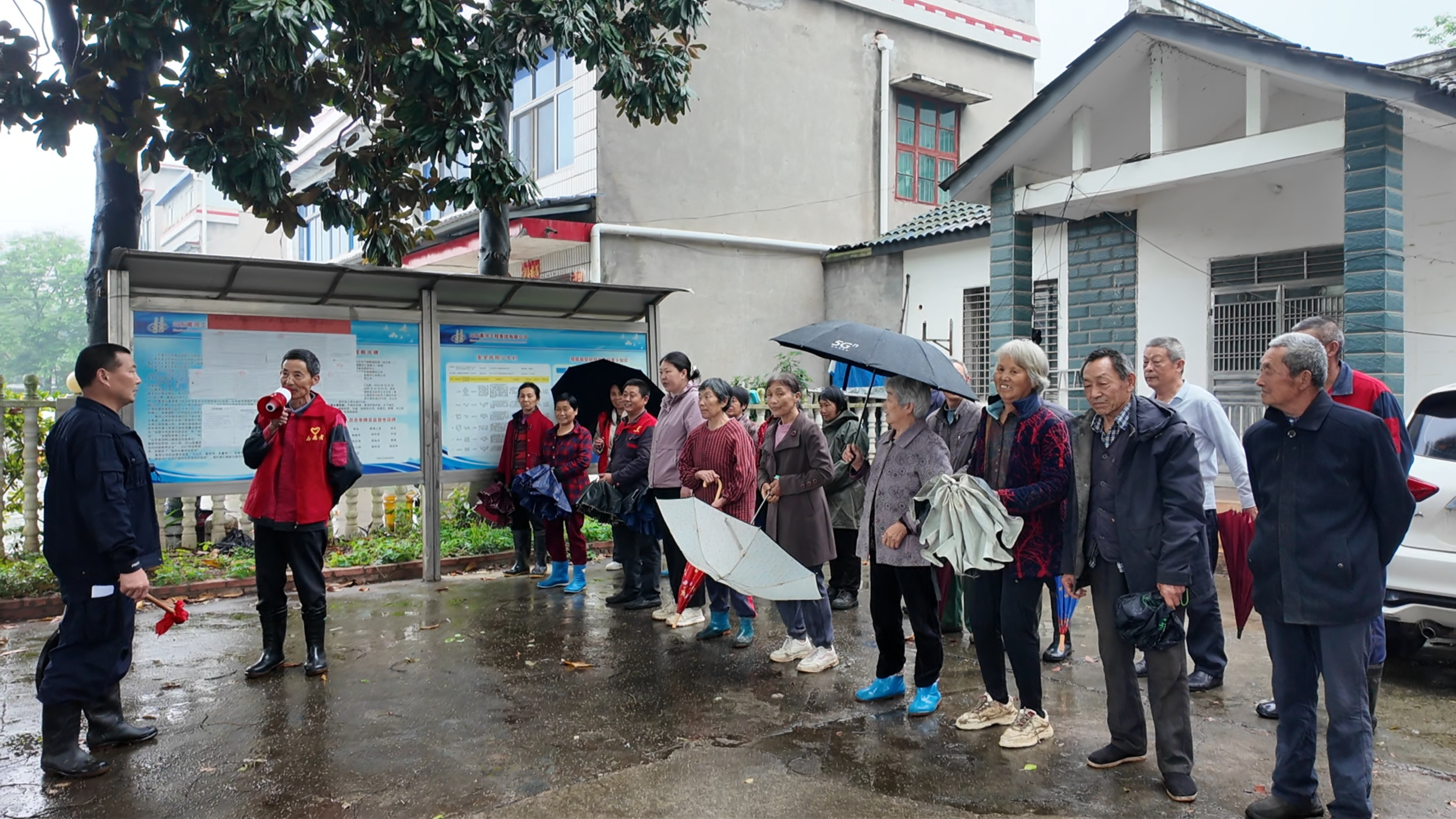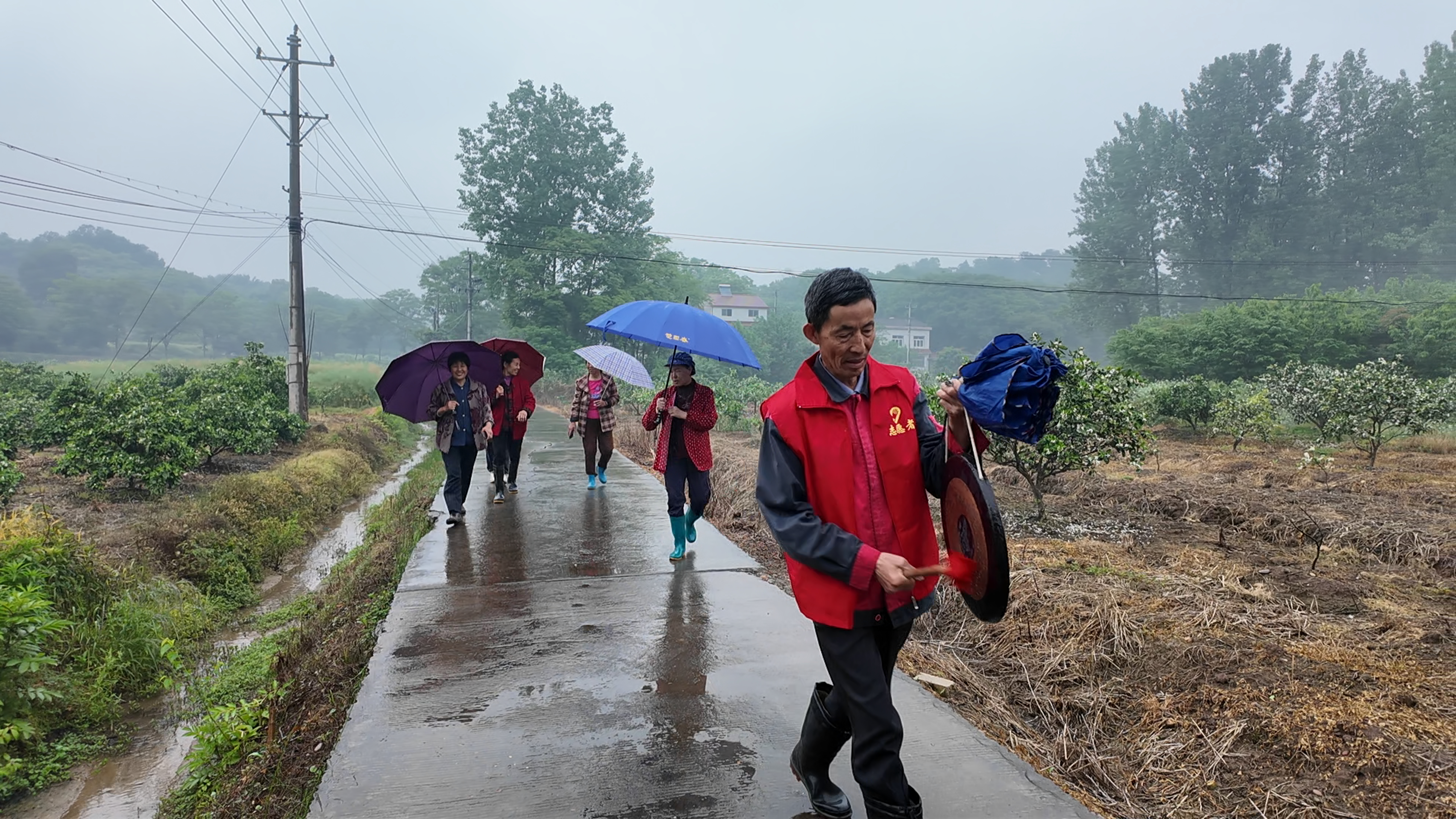 两美垸村地处董市镇东南部,濒临长江,地势低洼,部分区域为高坡土质结构,遇强降雨易发滑坡、崩塌等地质灾害。本次演练模拟持续强降雨引发山体裂缝扩张、土体松动,触发橙色预警。15时30分,监测员发现险情后迅速上报,村应急指挥部立即启动紧急避险转移预案。随着铜锣声和喇叭喊话声响起,村民在转移引导组带领下,沿预定路线有序撤离。演练涵盖监测预警、群众转移、安置清点、险情解除等关键环节,全程组织严密、响应迅速,短时间内完成全部群众安全转移。