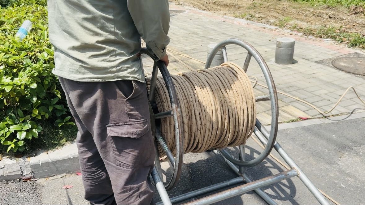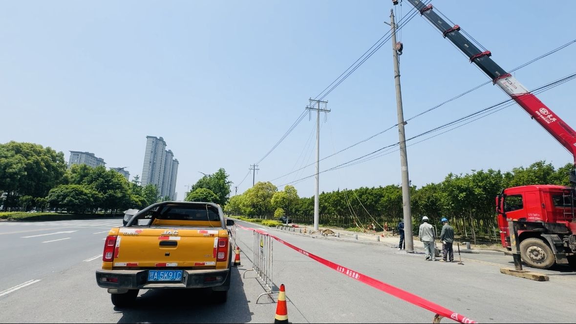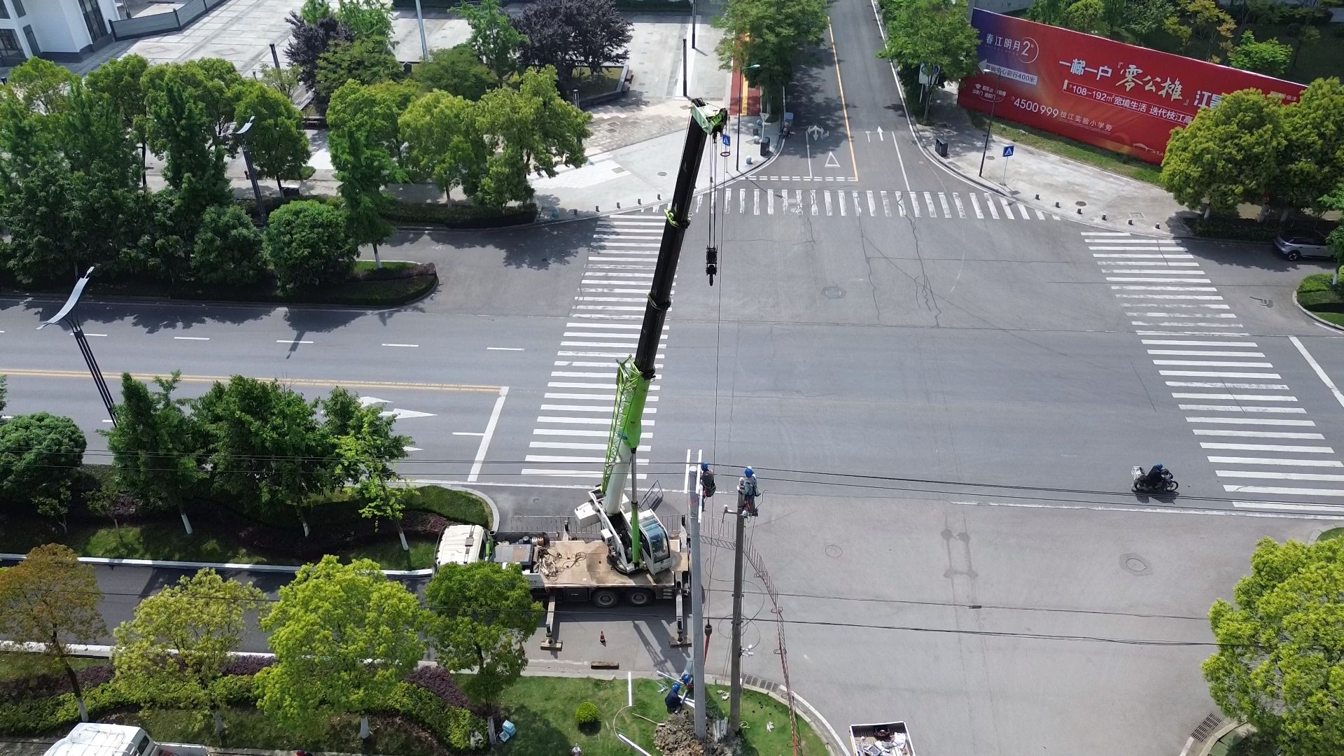 宜昌三峡送变电有限责任公司枝江分公司副经理王昌莅介绍:"目前项目按施工节点正常推进,已完成所有电杆组立施工,正进行导线展放。针对跨越3条道路带来的交通干扰大、安全风险高问题,我们提前办理了占道封路手续,增配巡查人员,设置硬质围挡、警示标志及隔离设施,保障交通畅通。针对施工影响800多户居民用电的问题,所有环节均采用带电作业及低压带电作业车保电方式,确保居民正常用电。下一步待业主开闭所及配电房建成后,将进行电缆、高低压开关柜施工,项目预计7月完工投运。"